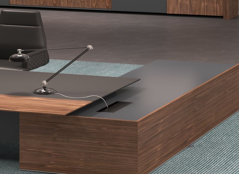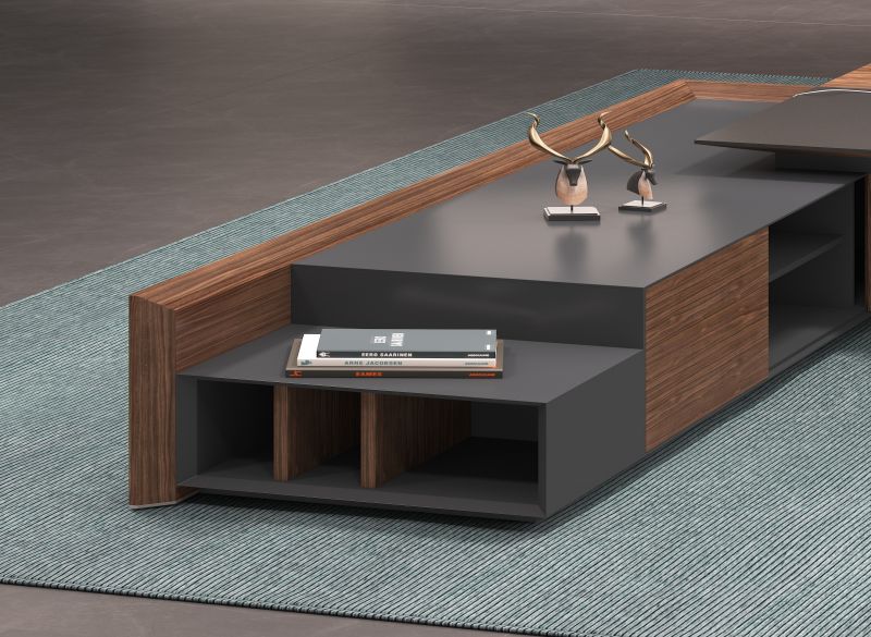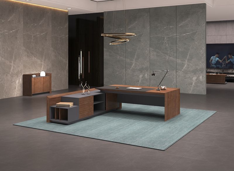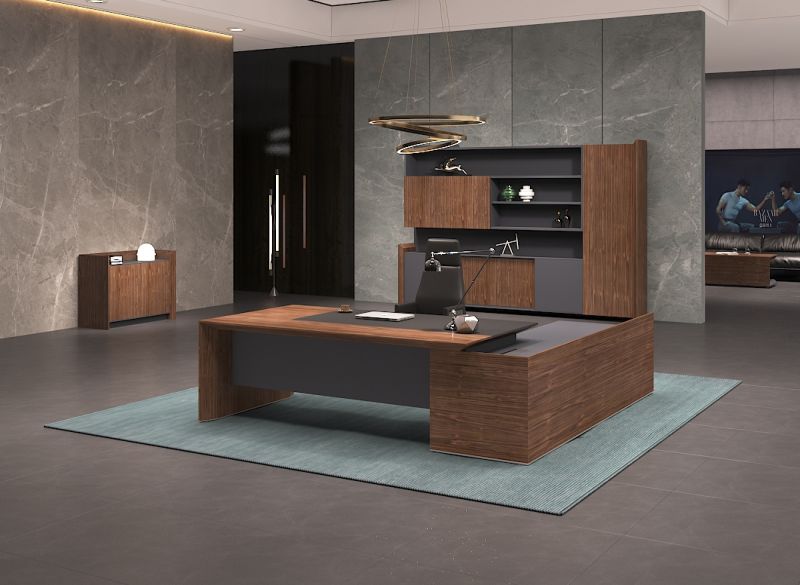 1、貼面材料:采用進口天然小山紋胡桃木皮,厚度0.6mm;對紋、對色加工 2、封邊用材:與貼面相同的木皮封邊; 3、基材:采用“上思華林”E0級高密度板; 4、油漆:面漆采用“華潤”PU聚脂漆; 5、五金配件:博格維斯品牌緩沖導軌、NOVEI緩沖門鉸;臺面配黑拉絲走線線盒,內含多功能線蓋板;班臺臺腳鋁拉絲裝飾; 6、特殊工藝:全系采用大斜邊和45度拉米諾連接工藝;